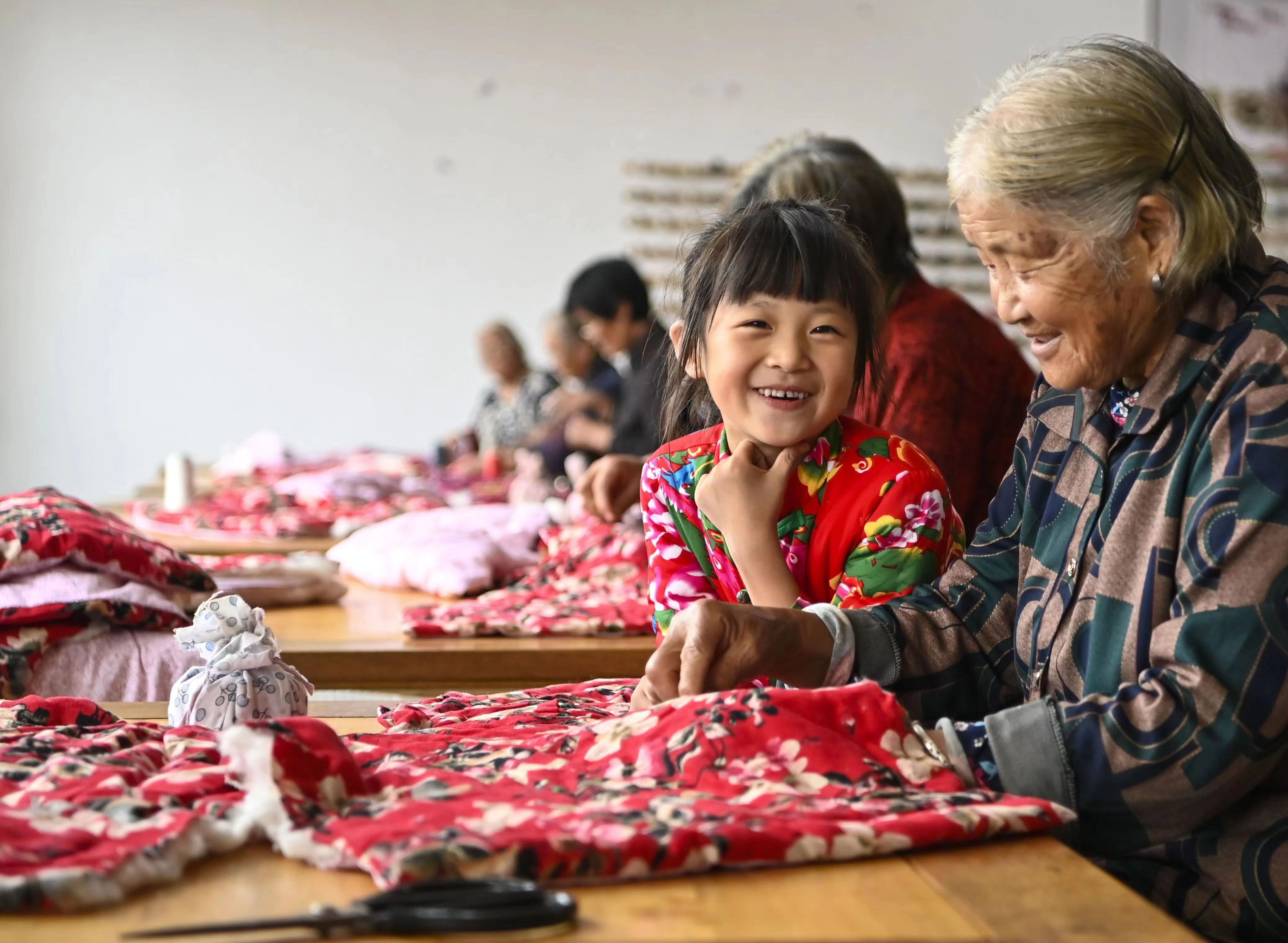 在山東沂水縣吳家樓子村,一名老人在教重孫女沂蒙小棉襖的縫制手藝(資料照片)。新華社發(fā) (王文劍 攝)