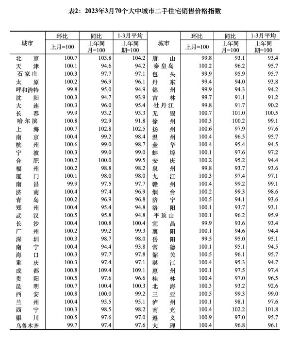 2023年3月70個大中城市二手住宅銷售價格指數(shù)。 截圖自國家統(tǒng)計局官網