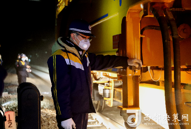 深夜,在柳家臺至古浪區(qū)間的兩臺線路搗固車發(fā)出震耳的轟鳴聲,打破了周圍的寂靜,搗固單元強(qiáng)有力的下插到道床深處。作業(yè)車輛的燈光點綴著夜空,黃色,紅色的燈光交織相錯,猶如一副深夜壯麗施工圖。在車下負(fù)責(zé)監(jiān)控的操作人員李偉一會握緊拳頭,一會揮動手臂和車內(nèi)操作人員進(jìn)行聯(lián)控操作,確保搗固單元準(zhǔn)確無誤的密實道床,提高線路道床的穩(wěn)定性。