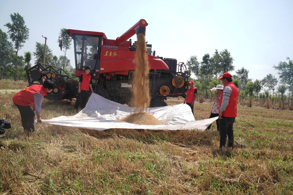 在河北邢臺經(jīng)濟開發(fā)區(qū)的一處麥田,志愿者正在幫助農(nóng)民收小麥。新華社記者 鄒尚伯 攝