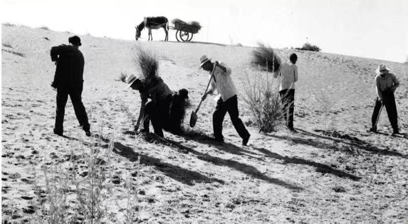 八步沙第一代治沙人在八步沙上壓沙時的場景(八步沙林場供圖)