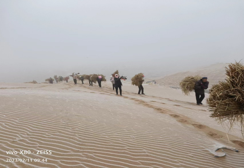 今年春季八步沙林場職工在麻黃塘沙區(qū)背草壓沙(八步沙林場供圖)