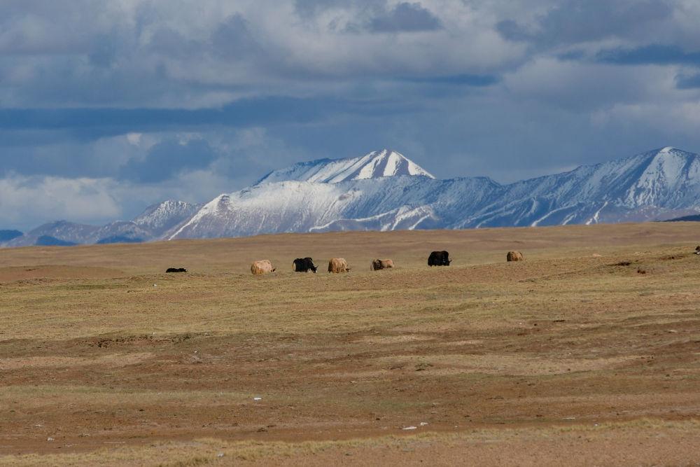 6月14日,在長江源地區(qū)的沱沱河附近,一群牦牛在覓食。