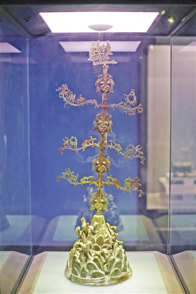 其中出土的東漢綠釉紅陶扶桑,俗稱“搖錢樹”。“搖錢樹”是我國西南地區(qū)的一種特殊陪葬品。“傳說搖動(dòng)樹干,就會(huì)源源不斷地掉下錢幣,在老百姓心中,它就是財(cái)富的象征。”秦佳穎說。