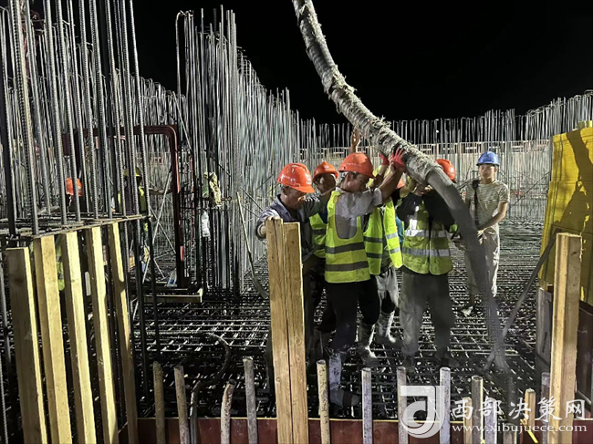 九層之臺,始于壘土。筏板作為基礎工程最重要的組成部分,其質量的好壞直接影響到上部結構的穩(wěn)固性。在完成筏板鋼筋綁扎后,2臺長臂泵車、34輛混凝土罐車開始送料。澆筑期間,映入眼簾的是一片繁忙之景,22名管理人員,110余名勞務人員正以時不我待的緊迫感,全力以赴抓緊抓實項目建設,共同助力項目建設跑出加速度。