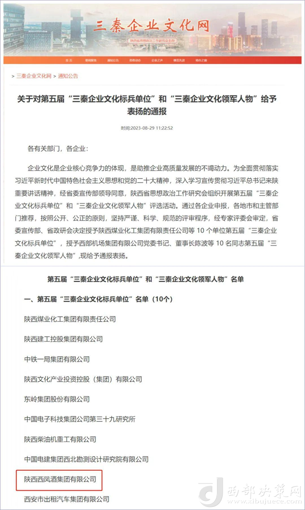 西部決策網(wǎng)訊(記者劉玉 韓宗憲 通訊員 馬迪)近日,從陜西省委宣傳部、陜西省思想政治工作研究會(huì)傳來(lái)喜訊,西鳳集團(tuán)公司以在企業(yè)文化建設(shè)方面的突出成績(jī),從眾多評(píng)選單位中脫穎而出,獲得“三秦企業(yè)文化標(biāo)兵單位”光榮稱(chēng)號(hào)。