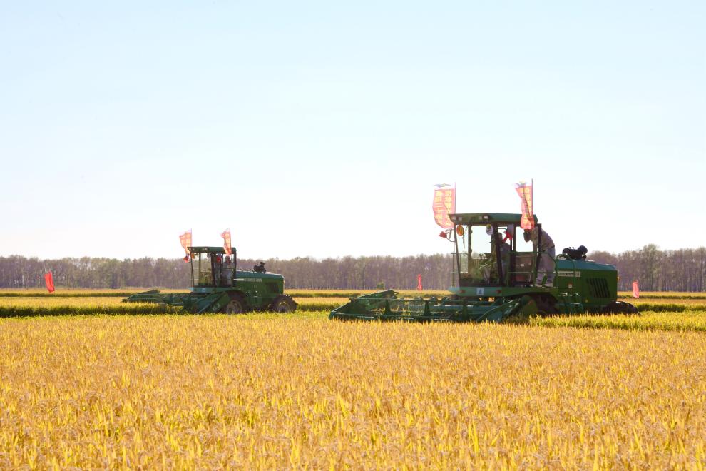 北大荒集團(tuán)普陽農(nóng)場(chǎng)有限公司第三管理區(qū)水稻種植綜合標(biāo)準(zhǔn)化示范區(qū)的割曬機(jī)分段收獲現(xiàn)場(chǎng)。(李道民 攝)