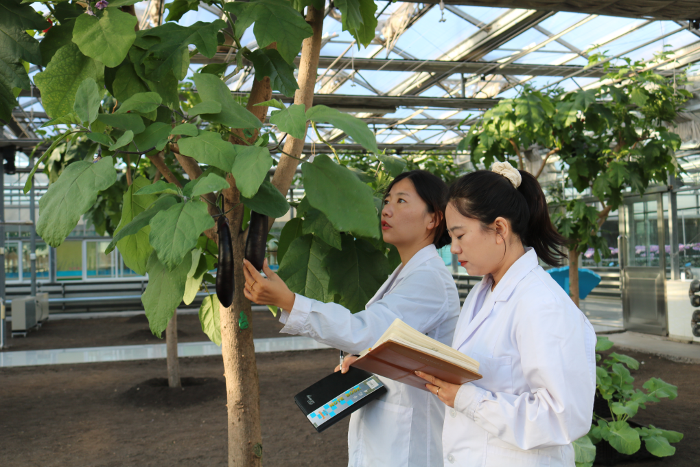 北大荒建三江國家農(nóng)業(yè)科技園區(qū)里,工作人員正在查看山茄樹上嫁接生長的茄子長勢。(受訪者供圖)
