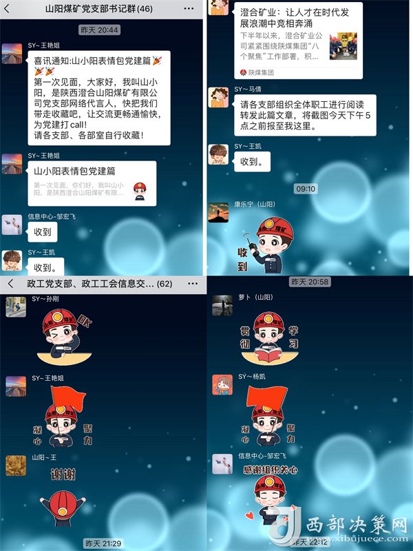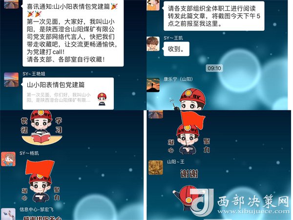 據(jù)了解,“山小陽(yáng)”表情包一經(jīng)上線,便博得了干部職工的喜愛(ài)、互動(dòng)、熱議以及推廣,“山小陽(yáng)”表情包涵蓋“為支部爭(zhēng)光、上黨課啦、交黨費(fèi)啦、注意安全、感謝組織關(guān)心.......”等交流常用的表情,他們身穿帶有山陽(yáng)煤礦標(biāo)識(shí)的工作服,頭戴安全帽,或微笑、或調(diào)皮、或嚴(yán)肅,多個(gè)動(dòng)作,在微信平臺(tái)、微信工作群中任大家選擇和使用,促使山陽(yáng)黨建文化以更加新穎的形式走進(jìn)黨員、干部職工的工作和生活中去,以接地氣、潛移默化的形式讓黨支部標(biāo)準(zhǔn)化建設(shè)工作入腦入心、見(jiàn)行見(jiàn)效。