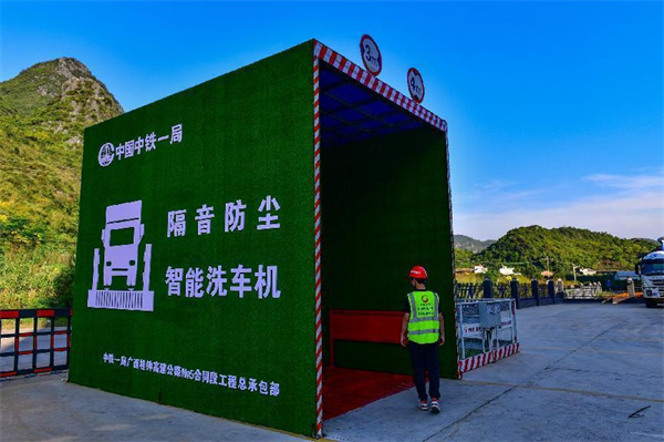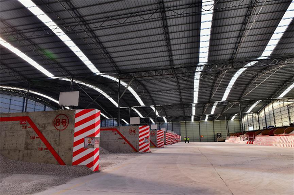 項目施工,拌和站建設(shè)必是首當其沖。5、8標拌和站建設(shè),大門劃分出分流道,使人車各行其道;設(shè)置保安室、門禁系統(tǒng),實行嚴格管里;劃分拌和作業(yè)區(qū)、材料堆放區(qū)及運輸車輛停放區(qū),起到有序作業(yè);站區(qū)設(shè)置自動噴淋洗車池、廢水沉淀池,布設(shè)排水系統(tǒng);拌和站四周設(shè)置圍墻圍欄,安裝視頻監(jiān)控系統(tǒng),實行封閉式、可視式實時管理;水泥拌和樓主體全封包,上料倉加蓋雨棚,除上料這面外,其它三面圍閉,且料倉間擋板延伸至雨棚頂,徹底隔斷串料隱患。料倉配備自動識別噴霧除塵設(shè)備,有效防止粉塵擴散,降低空氣污染;配備粗集料水洗設(shè)備,洗去微量的石粉和雜質(zhì),提高砂石的質(zhì)量。在此基礎(chǔ)上,兩家項目部各有創(chuàng)新亮點。