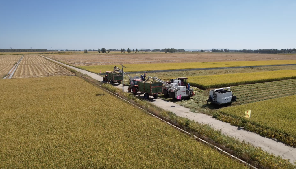 舒蘭是吉林省水稻主產(chǎn)區(qū),在平安鎮(zhèn)金星村學(xué)明家庭農(nóng)場,四臺水稻收割機(jī)穿梭田間,同時作業(yè)。據(jù)預(yù)測,今年舒蘭市糧食作物總產(chǎn)量將達(dá)120萬噸,其中水稻產(chǎn)量將達(dá)41.6萬噸。