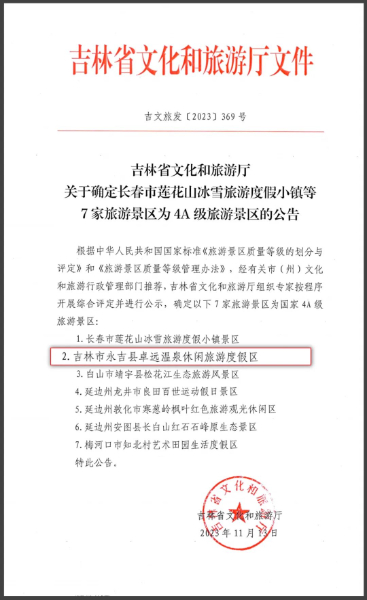 近日, 根據(jù)國家《旅游景區(qū)質(zhì)量等級的劃分與評定》和《旅游景區(qū)質(zhì)量等級管理辦法》,經(jīng)相關(guān)部門推薦,吉林省文化和旅游廳組織專家按程序開展綜合評定并進行公示,確定金恪集團旗下吉林卓遠溫泉休閑旅游度假區(qū)等7家旅游景區(qū)成為國家4A級旅游景區(qū)。