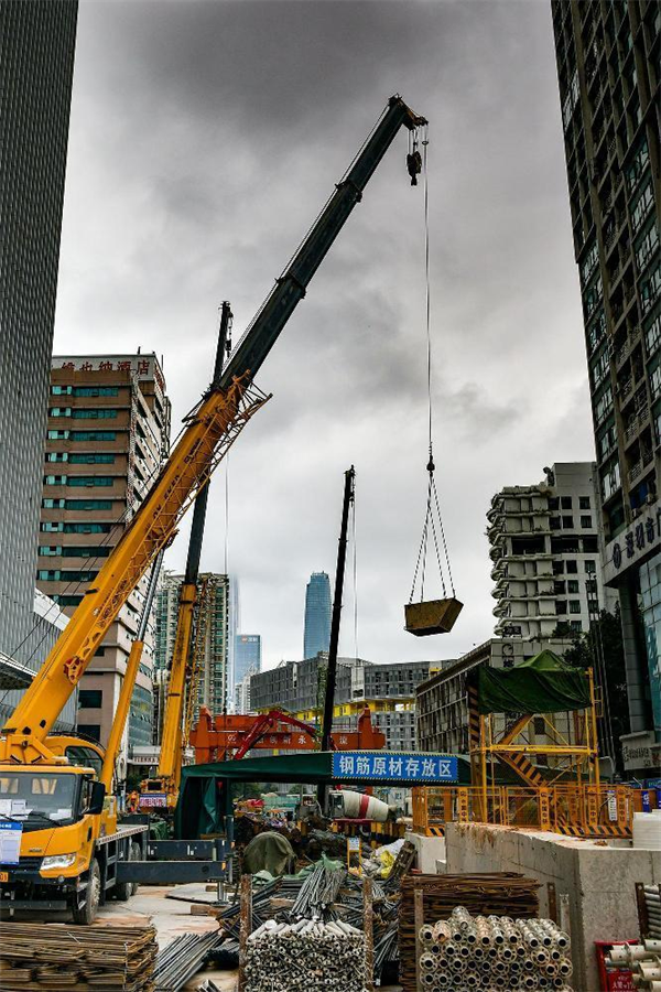 我們?cè)谧鳛楫?dāng)下施工主戰(zhàn)場(chǎng)的2號(hào)工點(diǎn)地面東邊施工現(xiàn)場(chǎng)看到,沒(méi)有明顯標(biāo)識(shí)卻能一眼分辨的“迷你”鋼筋加工場(chǎng)里,7、8名穿著“鋼筋工”馬甲的工人,或給鋼筋套絲,或彎制鋼筋構(gòu)件,或忙著調(diào)運(yùn)鋼筋捆……忙而不亂;在西邊,一臺(tái)抓斗機(jī)把土方從基坑里提出來(lái)放入旁邊的鐵鐵質(zhì)料斗箱里,一臺(tái)挖掘機(jī)又將箱里的土轉(zhuǎn)倒裝在運(yùn)土車?yán)铮裂b滿后鏟斗又將土壓實(shí)、將車幫上緣的土刮干凈,防止土在運(yùn)輸中掉落……