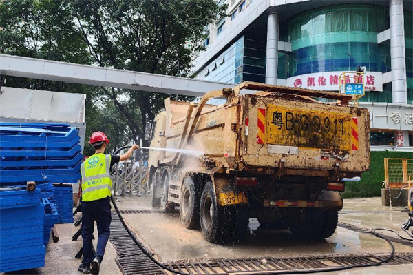 運(yùn)土車出工地大門前沖洗干凈