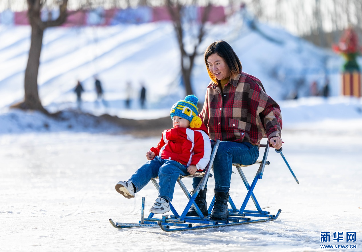 12月7日,家長(zhǎng)陪伴孩子在呼和浩特市玉泉區(qū)大庫(kù)倫村“冰雪大世界”內(nèi)體驗(yàn)滑冰車(chē)。新華網(wǎng)發(fā)(丁根厚 攝)