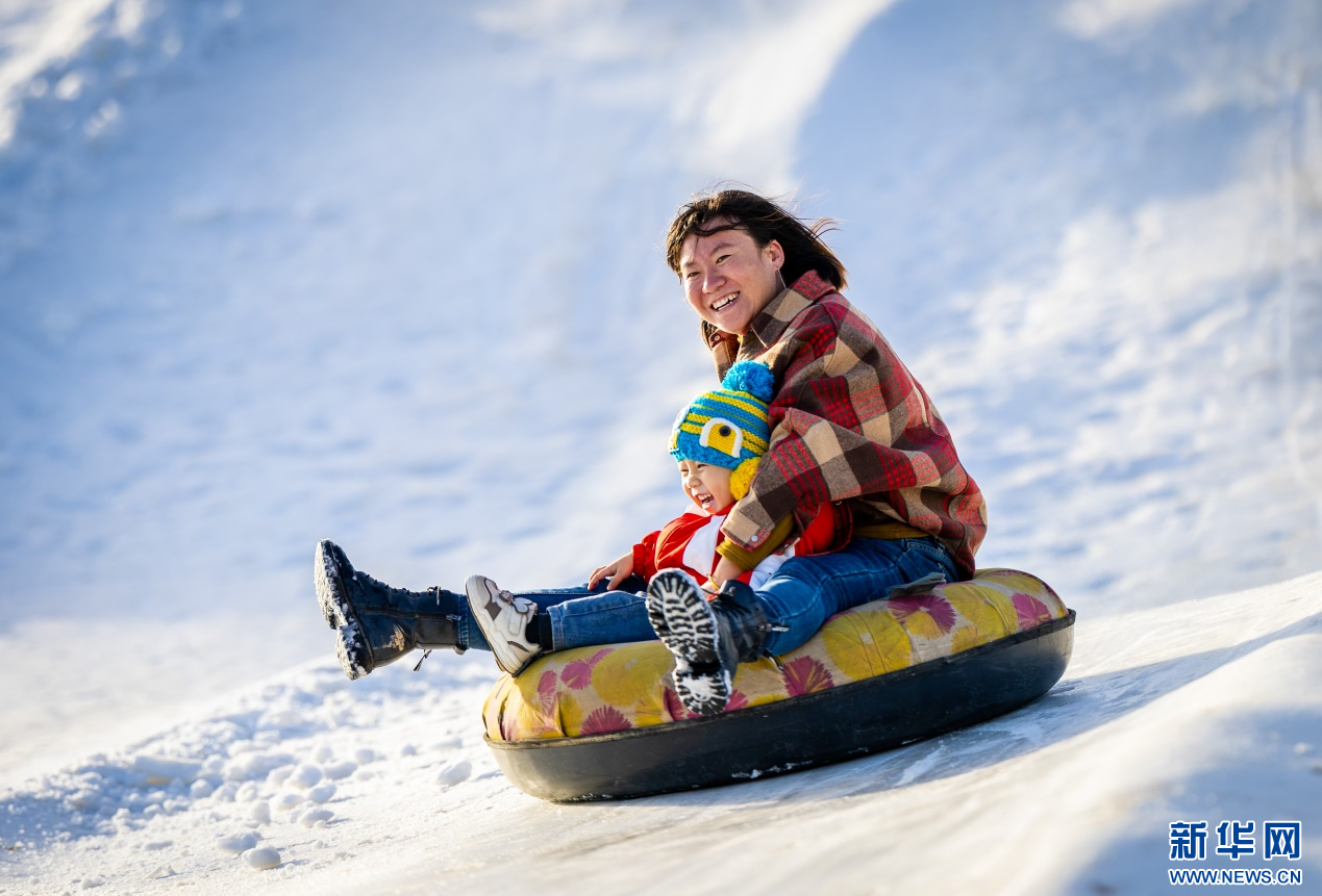 12月7日,家長(zhǎng)陪伴孩子在呼和浩特市玉泉區(qū)大庫(kù)倫村“冰雪大世界”內(nèi)玩雪圈。新華網(wǎng)發(fā)(丁根厚 攝)