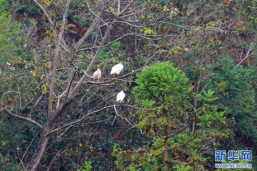 冬日,在石泉縣城關(guān)鎮(zhèn)絲銀壩村草池灣,3只朱鹮在樹上小憩。新華網(wǎng) 楊喜龍 攝
