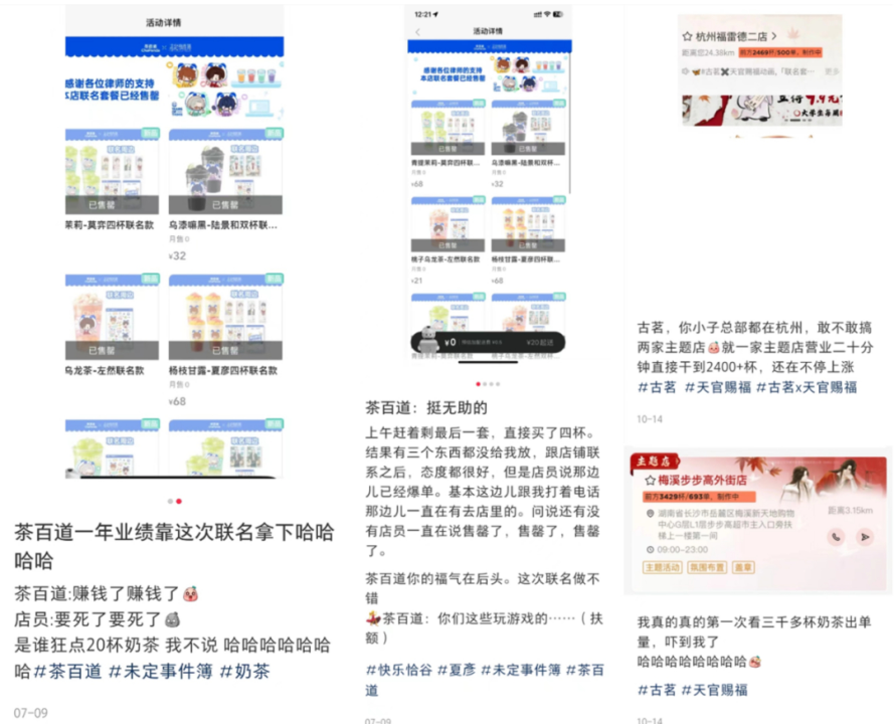 聯(lián)名在帶來高熱度的同時也讓茶飲店嘗到了爆單的甜頭。據(jù)網(wǎng)友在社交平臺分享,在茶百道與未定事件簿聯(lián)名活動第一天,許多門店就已經(jīng)出現(xiàn)聯(lián)名套餐已售罄的標(biāo)識;古茗與天官賜福聯(lián)名的線下主題店曾一度出現(xiàn)還有2000多杯甚至3000杯茶飲等待制作的現(xiàn)象。記者走訪了此前的聯(lián)名主題店,店員也回憶道:“當(dāng)時真的做不完!”