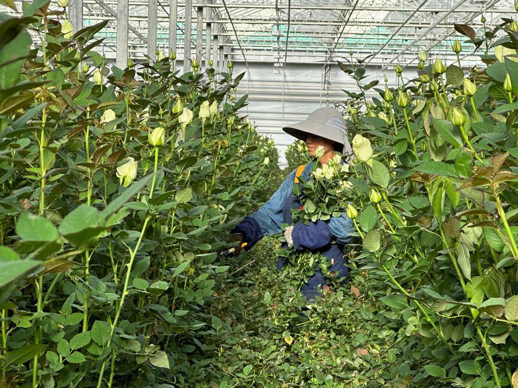 脫去厚重的外套,張小紅換上輕便的工作服,戴好手套和帽子,拿起大剪刀,開始了一天的剪花工作。只見她走進幽深窄密的綠色長廊,直到看不見人影。少許時刻,她便抱著一大捧玫瑰走了出來,新鮮的露水從嬌嫩的花瓣上滴落。平板車里盛滿清水,她和其他工人們一起,將新鮮采摘的玫瑰用網(wǎng)紗細心地裹好,然后放置水中。再過不久,這些玫瑰將被運往全國各地甚至海外,為人們帶來愉悅和享受。