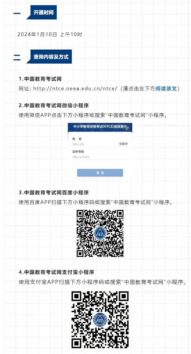 2023年下半年中小學(xué)教師資格考試(面試)結(jié)果、考試合格證明于2024年1月10日開通查詢,現(xiàn)將有關(guān)事宜通知如下: