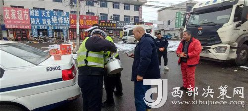2月23日,潼關(guān)縣交警大隊(duì)秦東中隊(duì)中隊(duì)長(zhǎng)梁寬鋒組織中隊(duì)民警為滯留的司機(jī)師傅送去火腿腸、泡面、熱水等物資,給司機(jī)和乘客倒上熱水送溫暖,并叮囑他們耐心等待。