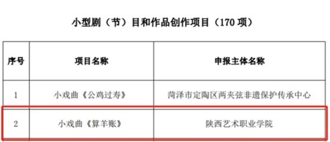 西部決策網(wǎng)訊(記者劉玉 韓宗憲 通訊員 吳卉)近日,國家藝術(shù)基金管理中心公布了《國家藝術(shù)基金(一般項(xiàng)目)2024年度資助項(xiàng)目公示名單》,陜西藝術(shù)職業(yè)學(xué)院教師彭馨韻申報(bào)的小戲曲《算羊賬》獲批舞臺(tái)藝術(shù)創(chuàng)作資助項(xiàng)目(小型?。ü?jié))目和作品創(chuàng)作項(xiàng)目)。