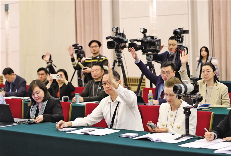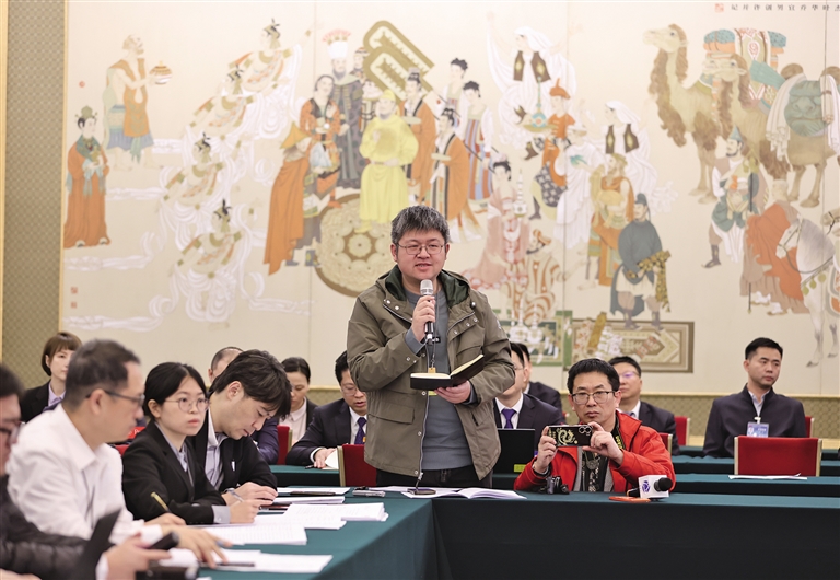 3月6日,中外媒體記者走進(jìn)北京人民大會(huì)堂,參加十四屆全國人大二次會(huì)議陜西代表團(tuán)媒體開放日活動(dòng)。圖為記者向代表提問。記者 母家亮攝
