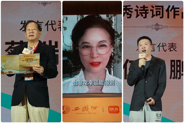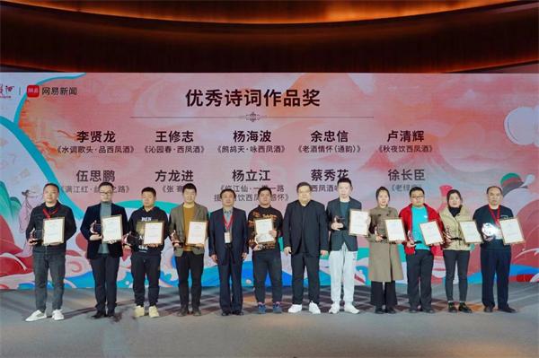會上,王士祥、李曉東分別作了題為《詩詞山河—古典詩詞與酒》《當代生活與傳統(tǒng)詩詞》的主題演講;網(wǎng)易文化高級主編章劍鋒公布比賽情況,與會領(lǐng)導(dǎo)為獲獎詩詞作品頒獎;獲獎代表蔡瑞義、鐘婉、伍思鵬分別作了發(fā)言;獲獎作品進行了現(xiàn)場表演展示。