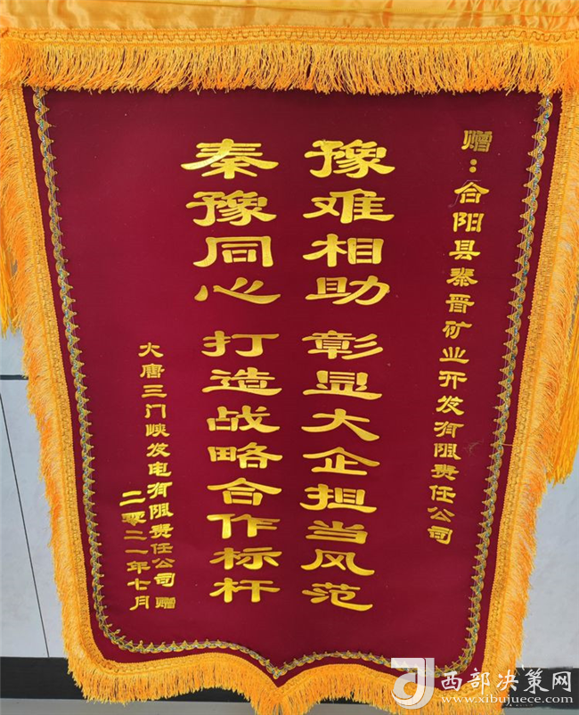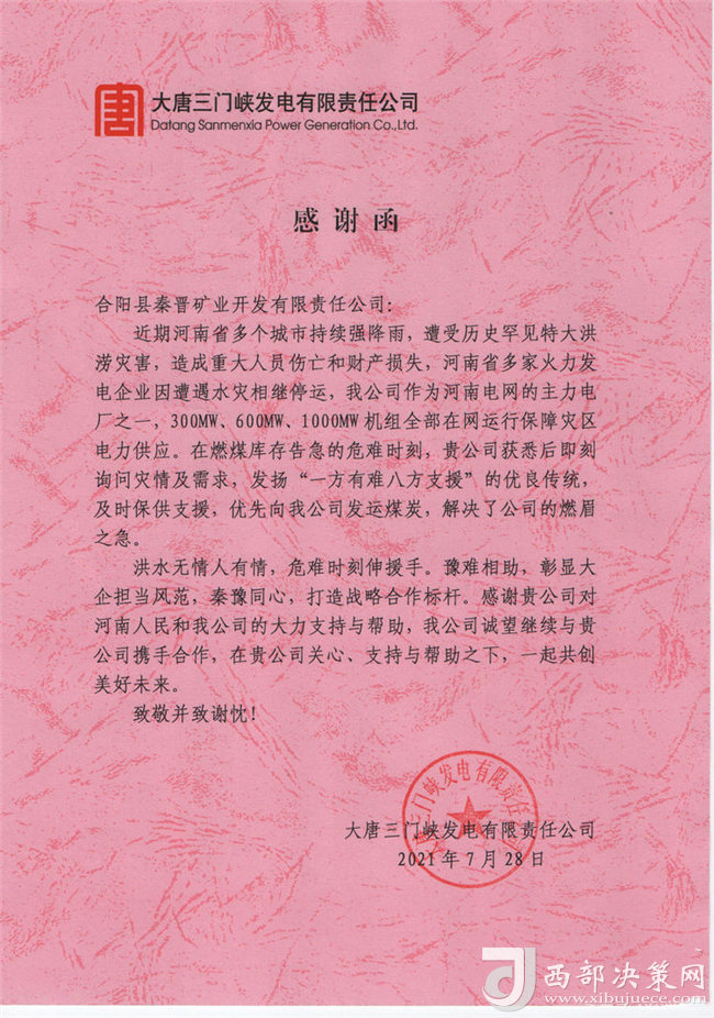 近日,大唐三門峽發(fā)電有限公司為秦晉集團(tuán)公司送來了感謝函,并將一面寫有“豫難相助,彰顯大企擔(dān)當(dāng)風(fēng)范,秦豫同心,打造戰(zhàn)略合作標(biāo)桿”的錦旗送到了秦晉集團(tuán)公司,對秦晉集團(tuán)“一方有難八方支援”的大愛精神表示感謝!(圖/文:聶曉英)